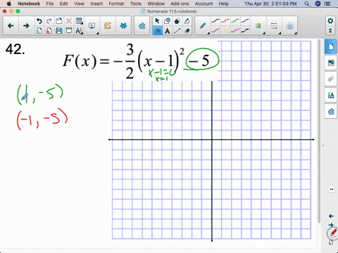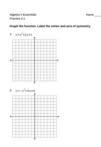 apse.upgrade-yourself.info › key-features-ofKey features of quadratic functions worksheet pdf Practice Worksheet: Graphing Quadratic Functions in Vertex Form For #1 -6, label the axis of symmetry, vertex, y intercept, and at least three more points on the graph. ... Write the quadratic function in standard form. 13] 14] 15] Author: Jess Armstrong Created Date: 1/29/2015 9:17:15 AM. Quadratic function calculator with vertex - tpd.coplanar.shop essential worker stimulus check 2022 minnesota; bicycle village; Newsletters; huggy wuggy costume; 31 baker st foxboro ma; char graffiti; big lots sectional How do you graph and label the vertex and axis of symmetry y=2x^2-x-1 ... The formula for the axis of symmetry for a quadratic formula in standard form is: x = −b 2a. Plug in the known values. x = −( − 1) 2 ⋅ 2. Simplify. x = 1 4. or. x = 0.25. Vertex: maximum or minimum point of a parabola. If a > 0, the vertex is the minimum point and the parabola opens upward. It is reversed if a < 0.
