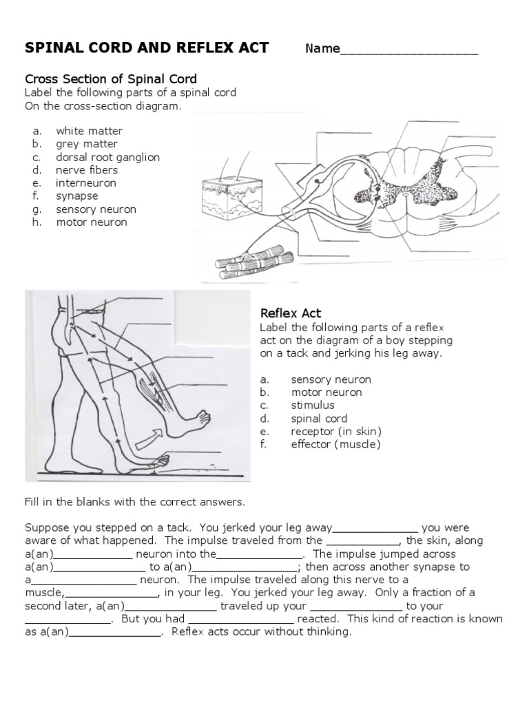 Worksheet 5 Spinal Cord - BIOL161 - Worksheet 5 Circuits and the Spinal ... The spinal cord is the major structure that connects the peripheral nervous system with brain. All 31 spinal Remember that although a nerve may be mixed, a single axon is either sensory or motor - it cannot be mixed. Our 12 cranial nerves can be classified as sensory, motor or mixed based on their function. Spinal Cord Labeling — Printable Worksheet - PurposeGames.com This is a free printable worksheet in PDF format and holds a printable version of the quiz Spinal Cord Labeling. By printing out this quiz and taking it with pen and paper creates for a good variation to only playing it online. Other Quizzes Available as Worksheets Eye Labeling Science Creator korimroberts19 Quiz Type Image Quiz Value 9 points Spinal Cord and Spinal Nerve Worksheet.docx - Spinal Cord... Label the 5 steps of a reflex: 2. The dorsal/posterior white matter of the spinal cord consists primarily of sensory and motor tracts. The columns of the white matter are called funiculi,the tracts within are called ascending and descending tracts. 3. Differentiate the structure and function of the white and grey matter of the spinal cord. Spinal Cord & Reflex Act Worksheet.pdf - SPINAL CORD AND... SPINAL CORD AND REFLEX ACT Name_____ Cross Section of Spinal Cord Label the following parts of a spinal cord On the cross-section diagram. a. white matter b. grey matter c. dorsal root ganglion d. nerve fibers e. interneuron f. synapse g. sensory neuron h. motor neuron Reflex Act Label the following parts of a reflex act on the diagram of a boy stepping on a tack and jerking his leg away. a ...